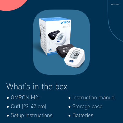 M2+ blood pressure monitor, arm cuff (22 - 42 cm), 4 "AA" batteries, storage case, instruction manual 1 & 2.
