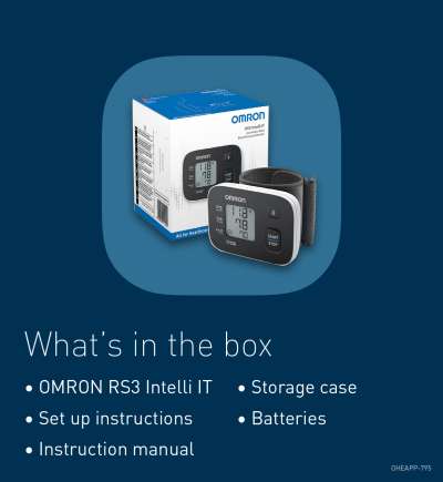 Included: RS3 Intelli IT wrist blood pressure monitor, 2× AAA batteries, Storage case, Instruction manual, Set up instructions
