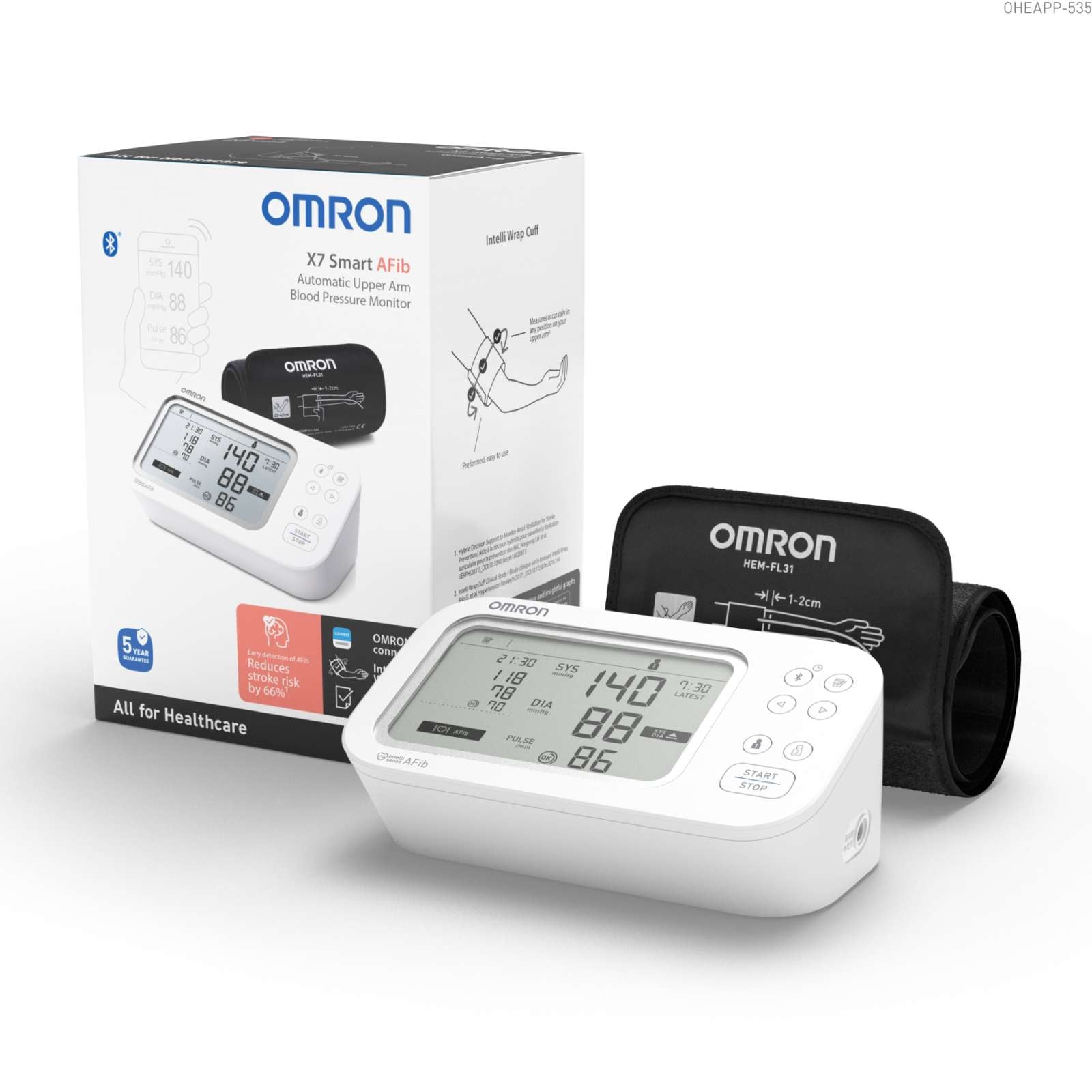 The device is designed for quick, intuitive operation with one touch measurement, a comfortable Intelli Wrap Cuff that supports correct positioning, and easy data review on its dual display or through the OMRON Connect app.