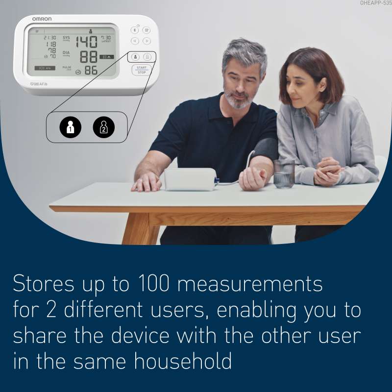 Yes. The device supports 2 users × 100 readings plus guest mode. You can compare results directly on the dual screen display or view longer term trends in the OMRON Connect app.